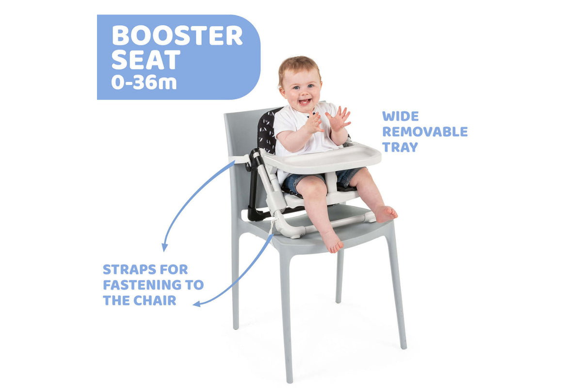 - Booster seat (6 – 36 m): equipped with a large removable tray, Chairy represents a practical aid to allow your child to share his first meals with the whole family.