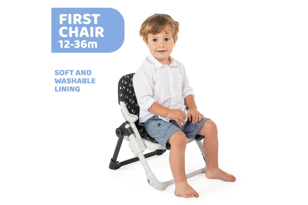- First chair (12 – 36 m): by removing the tray and the belts, the booster seat can be transformed into a comfortable seat to rest on the floor, which can be used for moments of play or relaxation.
