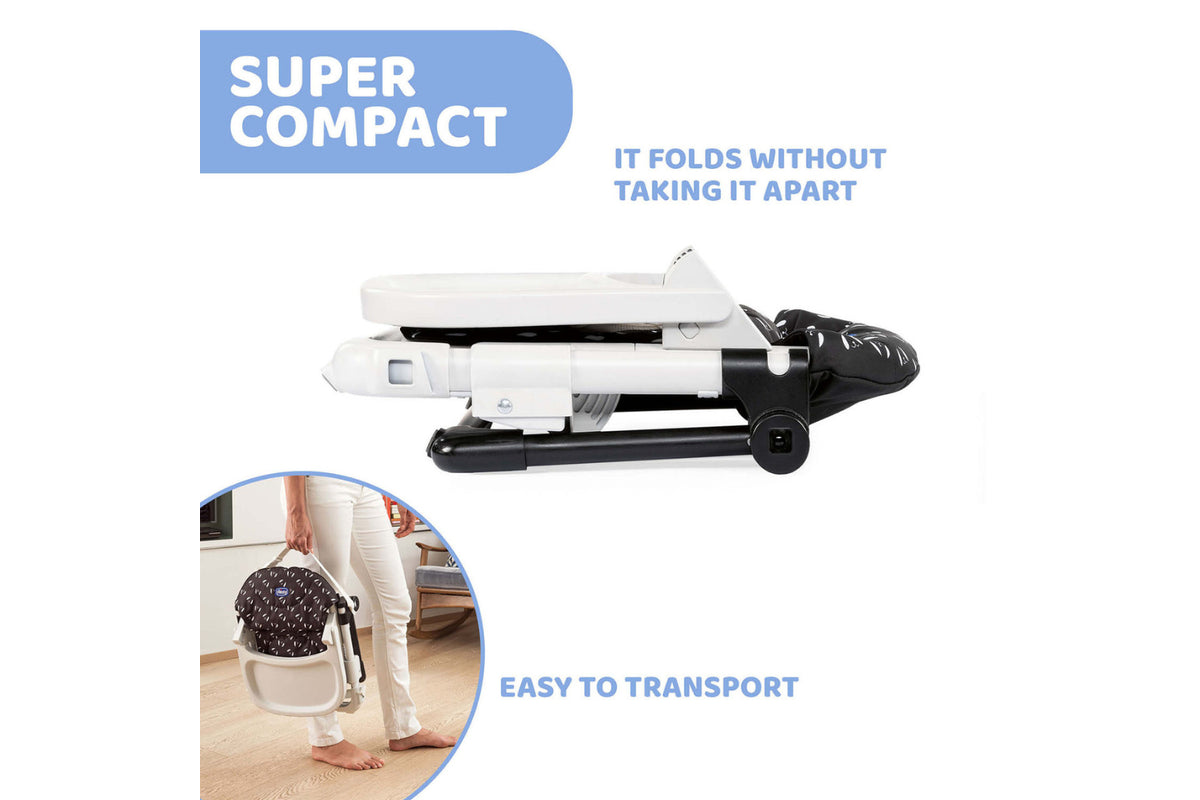 Chairy can be closed very simply and without removing the tray, to transport it easily and store it taking up little space at home.