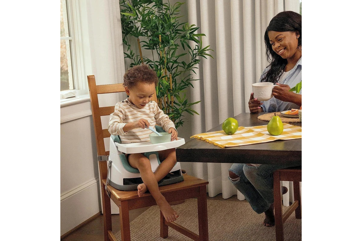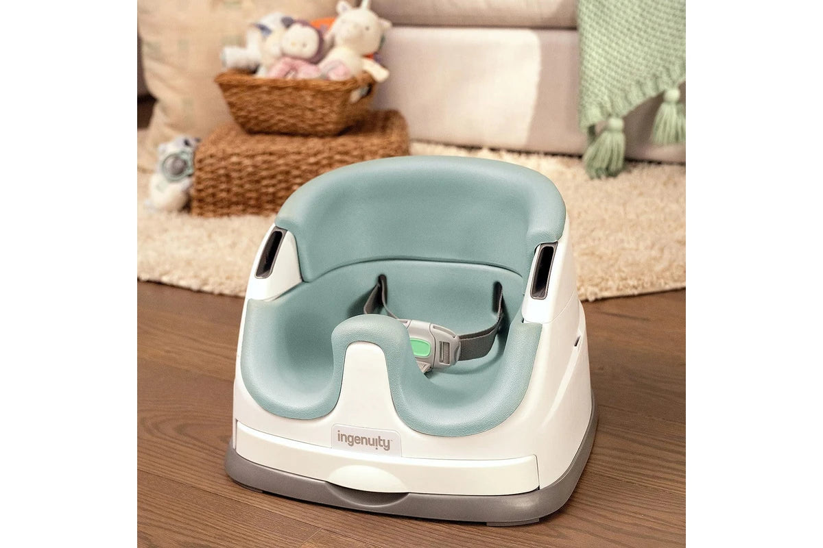 Baby Base 2-in-1 does just that! It provides the support that allows babies to sit up. With 2 modes of use, Baby Base 2-in-1 is designed for use on the floor or it can attach safely to a dining chair for use as a booster seat – making it perfect for playtime, dinner or travel. And there is a 3-point harness for safety.